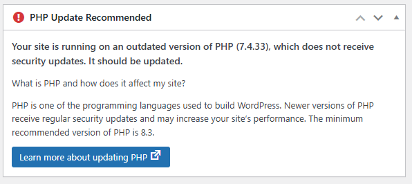 WordPress displays this message when your server is running an old version of PHP — the scripting language that powers WordPress. PHP 7.4 stopped receiving security updates, which puts your site at risk and may slow it down.